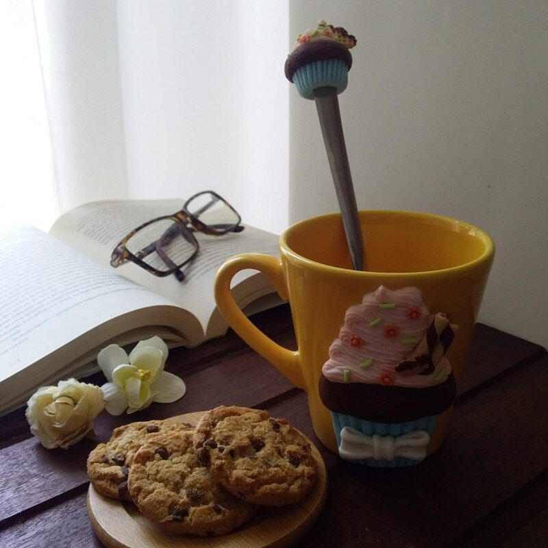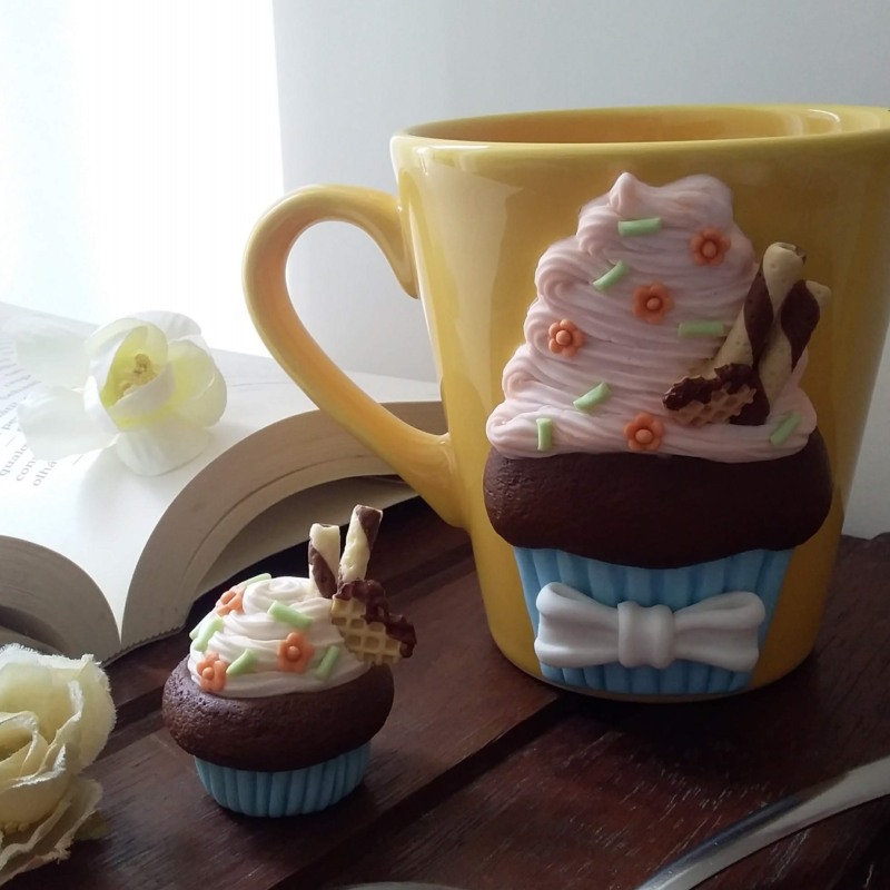 Caneca amarela de porcelana decorada em biscuit.