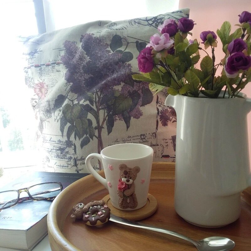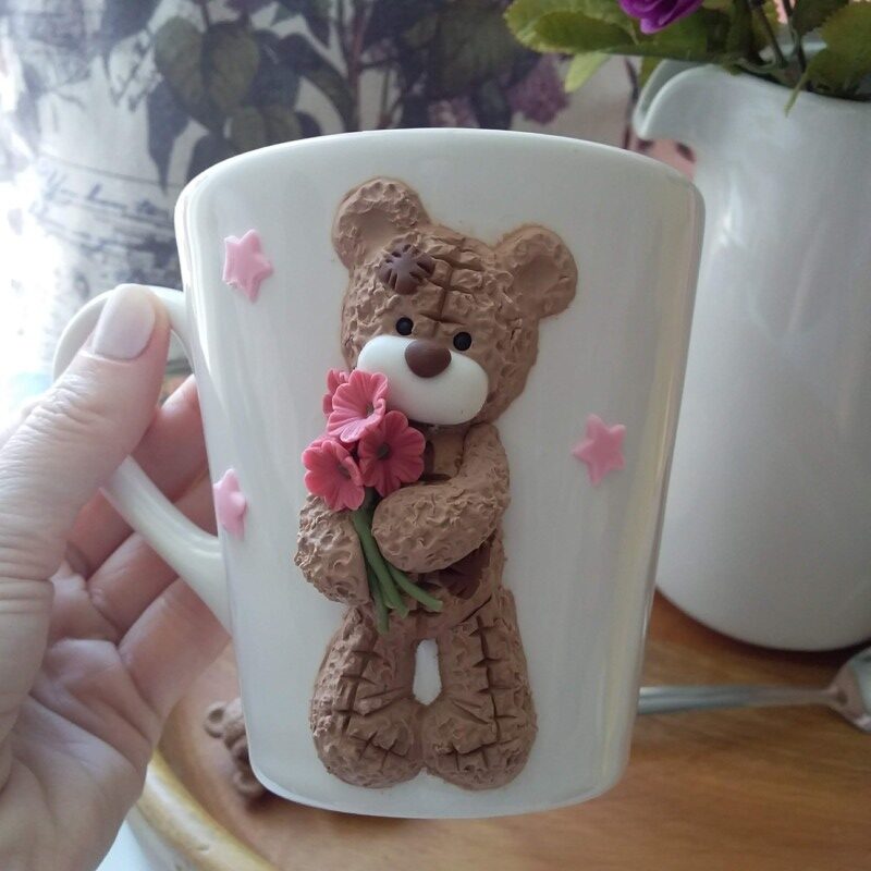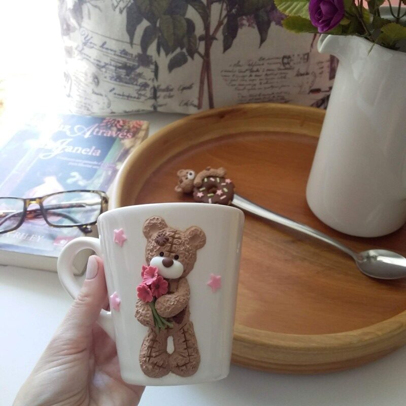 Caneca branca de porcelana decorada em biscuit.