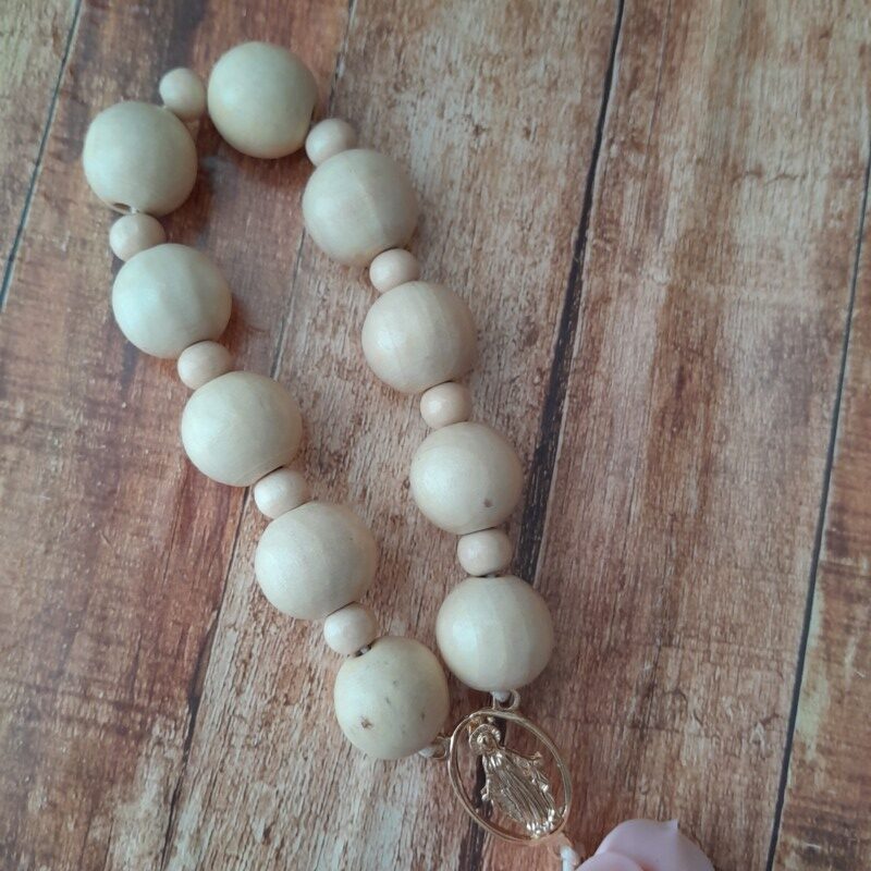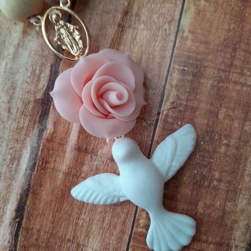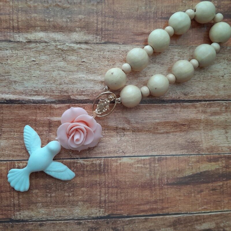Dezena do terço feita em biscuit, contas de madeira.