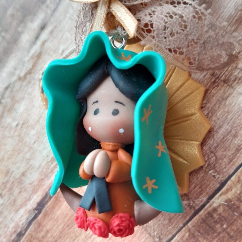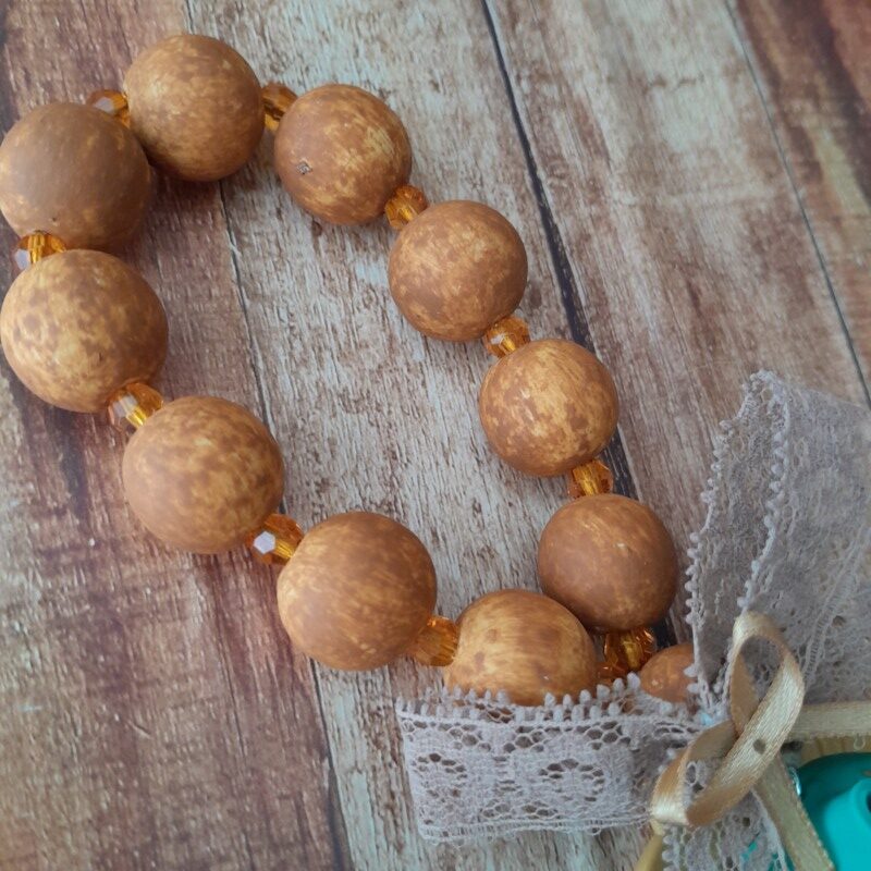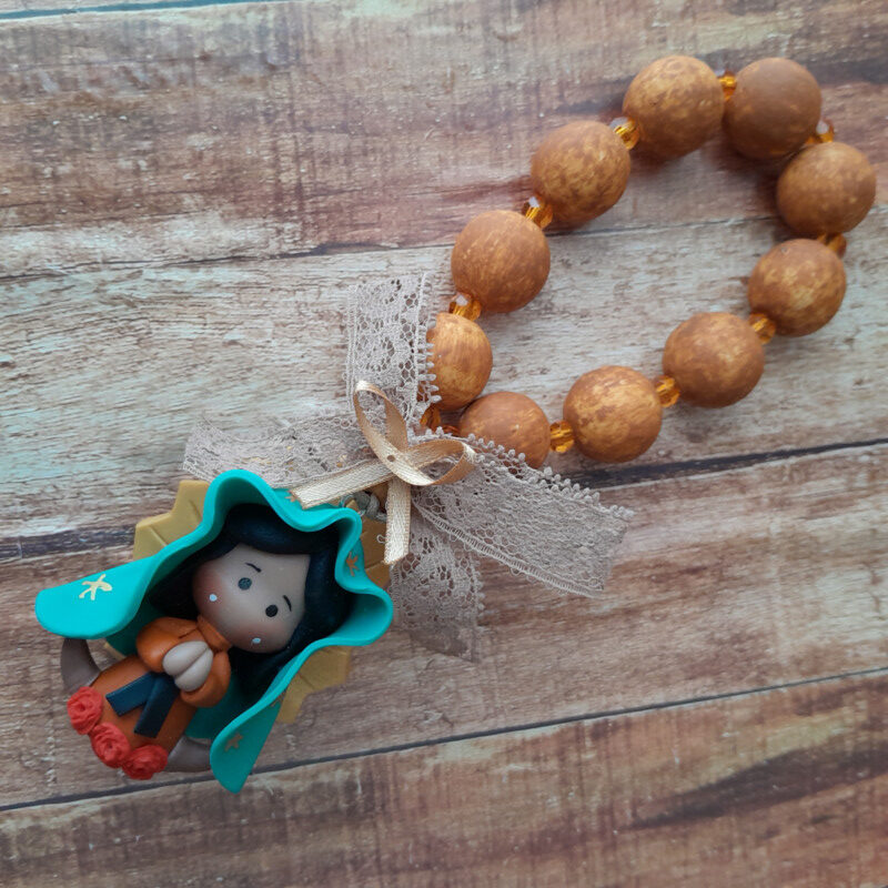 Dezena do terço feita em biscuit, contas de madeira pintada e contas de acrílico.