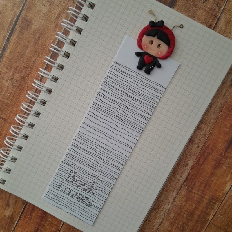 Marcador de página feito em PVC e lápis Faber Castell com aplique em biscuit.